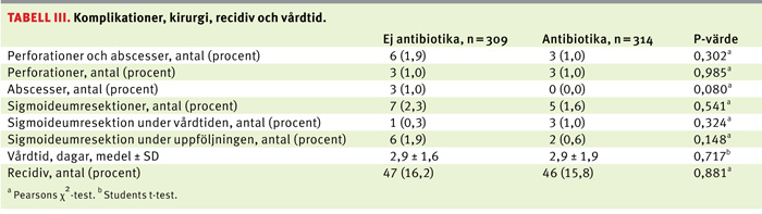 582 patienter kunde följas upp efter ett år och av dessa blev 93 (16 procent) återinlagda på grund av recidiv, lika i båda grupperna (Tabell III). I en logistisk regressionsmodell justerad för ålder, kön, feber, LPK, CRP, BMI, tidigare divertikulit, buksmärta, grad av palpationsömhet över buken, samsjuklighet och antibiotikabehandling fanns ett samband mellan tidigare divertikulit och recidiv (oddskvot 2,78; 95 procents konfidensintervall 1,76–4,41; P = 0,009). Inga andra variabler hade någon relation till förekomst av recidiv.