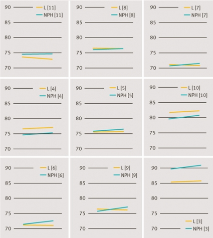 Viktuppgifter redovisas i Tabell III och IV. En översiktsbild av kroppsvikt (medelvärden) vid start och vid studieslut i nio studier visas i Figur 5. Underlaget har efter förfrågan lämnats ut av NovoNordisk. Data som presenteras är från de studier där behandling med de olika insulinerna givits på likartat sätt (tex tidpunkt på dygnet) (Figur 6).