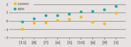 Vi har granskat dokumentation där insulin detemir jämförts med NPH-insulin i randomiserade studier. Alla studier har varit öppna med parallella grupper. Överlägsenhet har sällan varit det statistiska målet med studierna, och en sådan design kan naturligt ifrågasättas vid öppna studier. Design av typ non-inferiority är i stället ett vanligt alternativ. FDA underkände dock slutsatserna om non-inferiority i de flesta av de inlämnade studierna, eftersom doserna av bolusinsulin blivit högre i de grupper som fått insulin detemir.