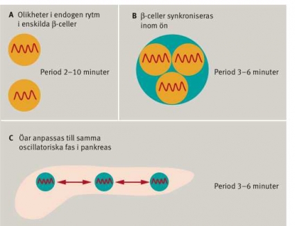 I likhet med ett antal andra hormoner kommer insulin i blodet att följa dygnsrytmen. Det finns också en insulinperiodicitet (30–120 minuter) som beror på cykliska förändringar av glukosnivån [2]. Vi kommer emellertid enbart att diskutera oscillationer av cirkulerande insulin som beror på beta-cellernas endogena rytm. Ursprungligen uppgavs att denna periodicitet var 12–14 minuter, dvs betydligt längre än de insulinpulser som produceras i isolerade langerhanska öar från human pankreas [3]. Efter förbättringar av analystekniken har det visats att pankreas frisätter insulin med periodiciteten 3–6 minuter [2, 4, 5].