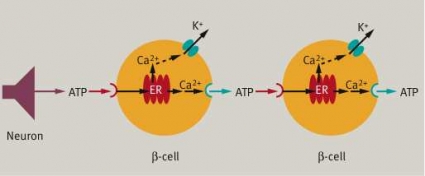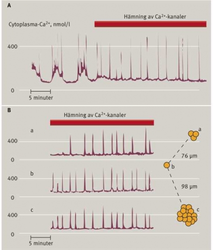 Studier av isolerade beta-celler visar att de glukosinducerade Ca2+-oscillationerna ibland är överlagrade med snabba spikar (Figur 2A). Dessa spikar beror inte på inflöde av Ca2+ utan på mobilisering av intracellulärt Ca2+. Spikarna har ofta en hyperpolariserande effekt (ökning av K+-permeabiliteten), vilket temporärt avbryter inflödet av Ca2+ genom de potentialberoende jonkanalerna. Om Ca2+-kanalerna blockeras med antagonister som metoxiverapamil kan spikarna studeras oberoende av Ca2+-oscillationerna (Figur 2). Försöksmodellen visar att Ca2+-spikarna är synkroniserade i närbelägna celler både i när- och frånvaro av direkt cellkontakt (Figur 2B). Detta kan förklaras med att beta-cellerna kommunicerar med signalmolekyler. Vi vet nu att extracellulärt ATP synkroniserar beta-cellernas Ca2+-spikar [7]. Figur 3 presenterar en modell för hur beta-celler via purinerga receptorer tar emot ett ATP-budskap. Härigenom genereras Ca2+-spikar, vilka stimulerar frisättningen av ATP från beta-cellernas sekretoriska granula. Processen initierar en kedjereaktion genom att frisatt ATP påverkar närbelägna beta-celler.
