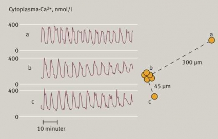 I de langerhanska öarna finns grupper av nästan perfekt synkroniserade beta-celler [8, 9], som är elektriskt kopplade via gap junctions [10]. Ca2+-rytmiken är också väl synkroniserad i hela ön, vilket ger upphov till 3–6 minuter långa insulinpulser (Figur 1B). Förutom den elektriska kopplingen sker samordningen via diffusibla faktorer, företrädesvis ATP. ATP-utlösta Ca2+-spikar har sålunda en synkroniserande effekt på oscillationerna i närbelägna beta-celler/aggregat (Figur 4). Studier av olika