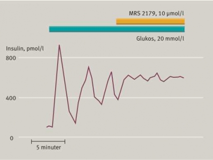 En ökning av blodets glukoskoncentration ger insulinoscillationer med större amplitud men har obetydlig inverkan på frekvensen [2]. På liknande sätt kommer sulfonylurea och glukagonlik peptid 1 (GLP-1) att förstärka oscillationerna medan inhibitorer av sekretionen, såsom somatostatin, har motsatt effekt. Störningar av insulinfrisättningens rytmik uppträder redan i förstadierna till diabetes [2]. Man kan med farmaka avlägsna oscillationerna utan att minska mängden cirkulerande insulin [14]. Ett intressant exempel är att inhibering av en receptor för ATP på cellytan ger kontinuerlig förhöjning av insulin i portavenen (Figur 5). Iakttagelsen understryker betydelsen av ATP som samordnare av pulserande insulinfrisättning inom och mellan öarna i pankreas.