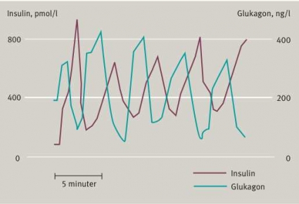 Ett viktigt målorgan för insulin är levern, vars sinusoider innehåller talrika fenestrationer. Det har övertygande visats att oscillationer av insulin ger mer uttalad hämning av levercellernas glukosproduktion än när motsvarande mängd tillförs kontinuerligt [2]. Av särskilt intresse är att oscillationerna av insulin i portavenblod är fasförskjutna 180° jämfört med oscillationerna av glukagon (Figur 6). Som en följd av denna antisynkroni kommer levercellerna att exponeras för mest insulin när koncentrationen av blodsockerhöjande glukagon är som lägst [19].
