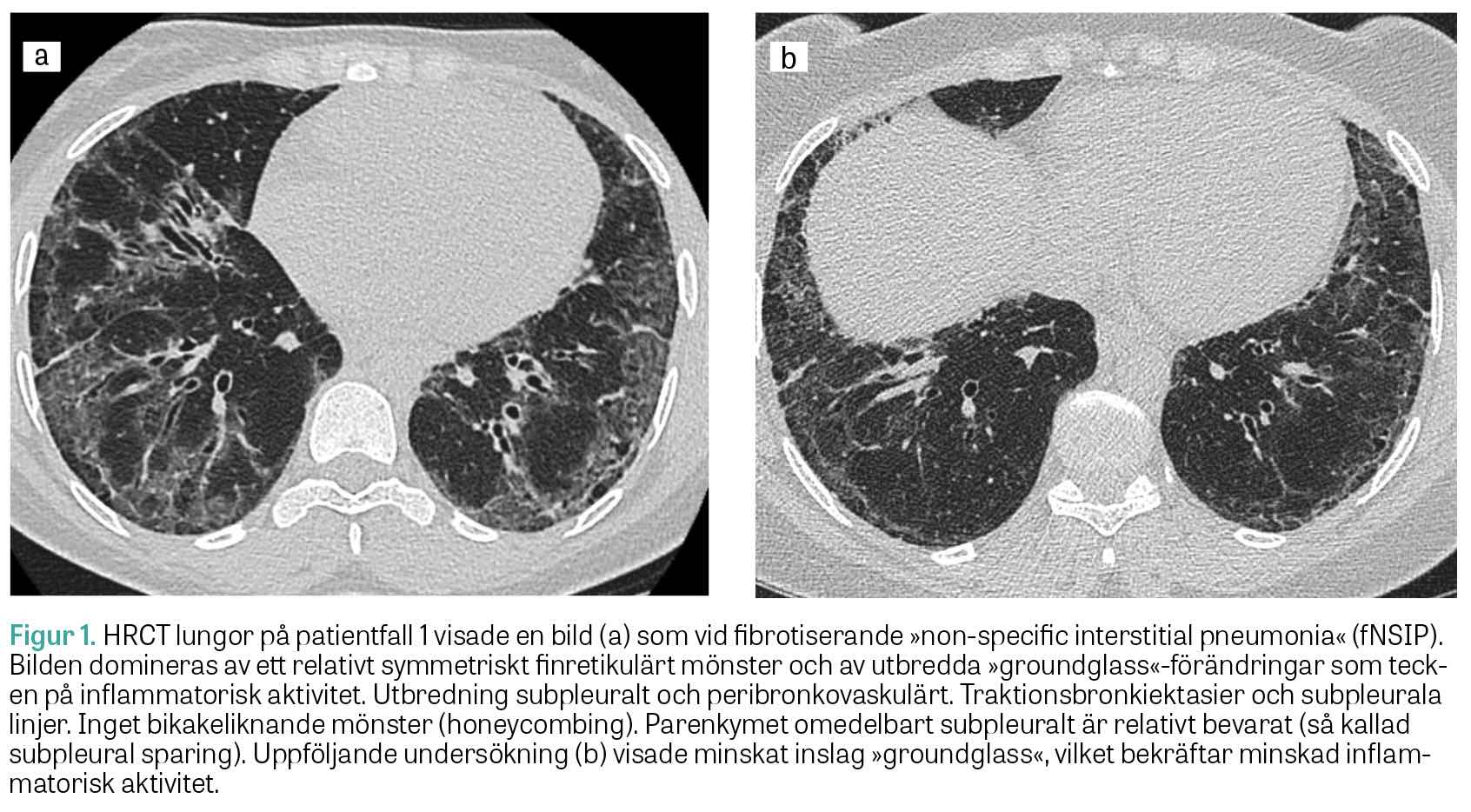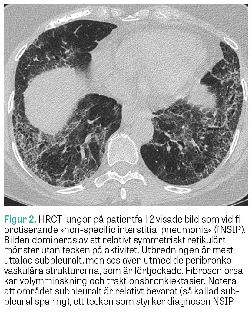 Fall 2. Den andra patienten är en icke-rökande tidigare frisk 65-årig kvinna, som insjuknade med hosta och andfåddhet och remitterades från vårdcentralen till lungmedicinsk klinik för utredning. HRCT lungor visade bild av NSIP. Bronkoskopi och bronkoalveolärt lavage utfördes utan att man såg tecken på infektion. Autoimmun serologi visade negativa ANA och positiva anti-Ro52-antikroppar. Spirometri visade TLC 65 procent, DLCO 45 procent och FVC 67 procent av förväntad funktion. Hon fick påbörja behandling med prednisolon (30 mg/dag), utan nämnvärd klinisk förbättring. Ny HRCT lungor visade påtaglig progress av fibros och även »ground glass«-förändringar förenliga med pågående inflammatorisk aktivitet. Spirometri visade oförändrade värden. Vid diskussion på en multidisciplinär konferens föreslogs komplettering med myositantikroppar, som visade stark positivitet för anti-PL-12 och anti-Ro52. Diagnosen anti-PL-12-positivt antisyntetassyndrom med isolerat lungengagemang kunde fastställas 12 månader efter symtomdebut.