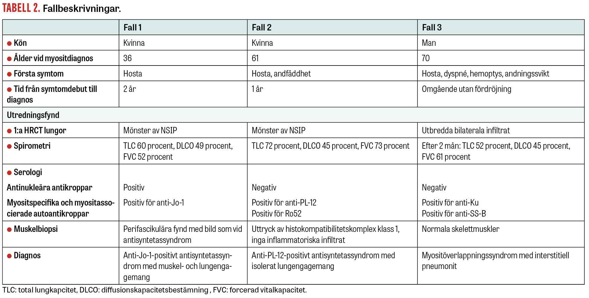 För patient 1 och 2 tog det 2 respektive 1 år från symtomdebut till dess att diagnosen interstitiell lungsjukdom med myosit fastställdes och adekvat behandling påbörjades. I det första fallet fanns misstanke om interstitiell lungsjukdom, men HRCT utfördes inte initialt då patienten avbokade undersökningen. Först två år senare, när muskelsvaghet hade tillkommit, uppstod misstanke om inflammatorisk systemsjukdom och serologisk testning utfördes. Man kunde då fastställa diagnosen antisyntetassyndrom baserat på förekomst av anti-Jo-1. HRCT lungor visade då mönster av NSIP, som är typiska för antisyntetassyndrom. I fall 2 remitterades patienten till lungmedicin, där interstitiell lungsjukdom påvisades vid HRCT-undersökning av lungorna. Eftersom ANA var negativa utfördes testning för myositspecifika antikroppar först ett år senare. Man kunde då påvisa anti-PL-12 och diagnosen anti-PL-12 positivt antisyntetassyndrom kunde fastställas. För patient 3 var förloppet mycket kortare från symtom till diagnos. Trots negativa ANA testade man omgående för autoantikroppar associerade med myosit och fann förekomst av anti-Ku. Patienten fick diagnosen myositöverlappningssyndrom med interstitiell pneumonit och kunde starta immunmodulerande behandling.