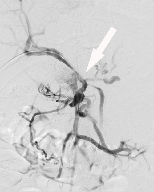 En annan relativt ny metod är selektiv intern radioterapi (SIRT), som innebär att radioaktiva mikrosfärer deponeras lokalt via en arteriellt inlagd kateter för behandling av levertumörer [7] (Figur 3). För att tillförsäkra maximal effekt och samtidigt säkerhet vid injektion av dessa radioaktiva mikrosfärer utförs angiografisk kartläggning av kärl och eventuell embolisering av extrahepatiska artärgrenar ca 1 vecka innan behandling ska ske. Noggrann planering för tillverkning och transport av dessa radioaktiva mikrosfärer är essentiell liksom strålskyddsåtgärder vid hantering och behandling.