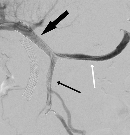 Figur 1. Pankreascancer. Övre bilden visar förträngd vena portae samt konfluens av vena lienalis och vena mesenterica superior (pil). Undre bilden visar vena portae (tjock svart pil), vena mesenterica superior (tunn svart pil) och vena lienalis (vit pil) öppnade med stentar.