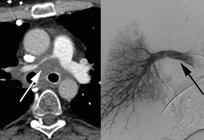 Figur 2. Av tumör förträngd höger arteria pulmonalis (datortomografi) öppnad med stent (arteriogram).