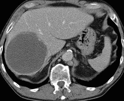 Figur 3. Karcinoidmetastas i levern. Delvis nekrotisk metastas före SIRT (selektiv intern radioterapi) (övre bilden). Oförändrad storlek av nekrotisk metastas 2 år efter SIRT-behandling (undre bilden).