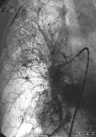 Avlägsnande av främmande kroppar från lungcirkulationen, t ex bitar av katetrar, är ett välkänt interventionellt ingrepp, liksom placering av filter i vena cava. Vena cava-filter förhindrar lungemboli hos riskpatienter, som inte kan behandlas med antikoagulantia och/eller inför kirurgi som kräver långvarig postoperativ immobilisering. Nya typer av filter kan avlägsnas efter upp till 180–270 dagar om de inte längre behövs. Interventionell behandling av pulmonella embolier med embolusfragmentering och -aspiration är prövad [13], men en i Sverige ännu inte allmänt accepterad metod (Figur 4). Även behandling av benigna förträngningar i lungartärer med ballongdilatation visar lovande resultat [14].
