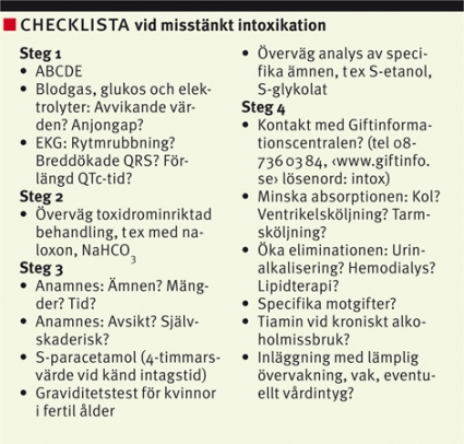 Bedömningen av patienter med misstänkt intoxikation försvåras ofta av en bristfällig och opålitlig anamnes. Vi presenterar här en stegvis modell för det initiala omhändertagandet av dessa patienter på akutmottagningen. Artikeln fokuserar på stabilisering och tidig utredning snarare än på behandling av specifika förgiftningar. Modellen baseras på översiktsartiklar och studier funna via litteratursökning i PubMed.
