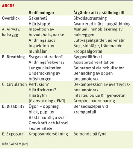 ABCDE. Först görs en bedömning av vårdpersonalens säkerhet. Ökad kräkningsrisk, förekomst av missbruk och eventuell blodsmitta hos intoxikerade gör handskar, förkläde och ögonskydd extra angelägna. Vid våldsbenägenhet kan extra personal, ibland polishjälp, behövas.