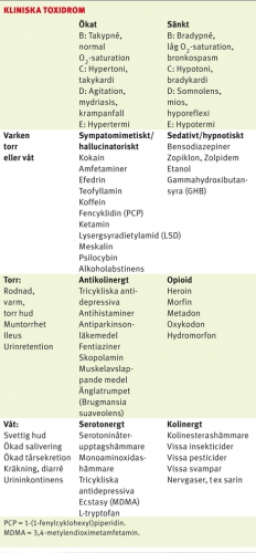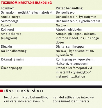 Kolinergt toxidrom uppkommer vid exponering för nervgaser, pesticider och kolinesterashämmande läkemedel och kännetecknas bl a av chock och hypersekretion. Toxidromet är viktigt att känna igen eftersom det kan röra sig om omfattande förgiftningar med flera offer [12, 13]. Patienter som kommit i kontakt med nervgaser eller pesticider bör saneras innan de tas in på akutmottagningen. Överaktivering av nikotinerga receptorer ger fascikulationer och svaghet, medan aktivering av muskarina receptorer leder till salivering, bronkkonstriktion, mios och bradykardi. Muskarina symtom kan saknas hos barn [14,15]. Atropin motverkar muskarina symtom (initial dos 2–5 mg intravenöst till vuxna; 0,05 mg/kg intravenöst till barn), medan enzymreaktivatorn obidoxim (Toxogonin) motverkar både muskarina och nikotinerga effekter [16]. Guillain–Barrés syndrom och botulism är tänkbara differentialdiagnoser.