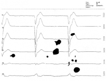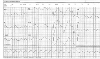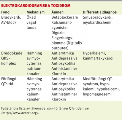 Förlängd QTc-tid. Substanser som blockerar hjärtmuskelcellernas kaliumkanaler inhiberar repolarisationen. Detta återspeglas av förlängd QTc-tid [22]. Tillståndet ökar risken för polymorf ventrikulär takykardi, oftast torsade de pointes. Korrigering av hypokalemi, hypomagnesemi och hypokalcemi är viktiga förebyggande åtgärder [4, 5]. Intoxikationsutlösta torsade de pointes behandlas med intravenös magnesiumsulfat [4] (1–2 g till vuxna [26]; 25–50 mg/kg till barn [27]).