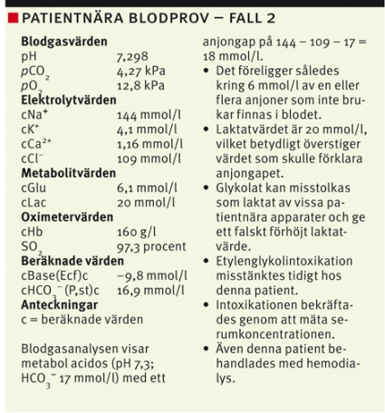 Laktacidos ses vid många intoxikationer, bl a metformin, cyanid, järn, salicylat och isoniazid och kan bero på direkt effekt av laktatmetabolismen, intoxikationsutlöst cirkulationssvikt och/eller kramper [29]. Vid rökgasinhalation talar laktacidos för cyanidförgiftning och motiverar akut behandling med hydroxikobalamin (ge Cyanokit 5 g intravenöst under 15–30 minuter till vuxna; 70 mg/kg till barn) [30]. Andra viktiga differentialdiagnoser är sepsis, krampanfall och tarmischemi. Vissa patientnära mätinstrument misstolkar glykolat som laktat och kan visa ett falskt förhöjt laktat som avsevärt överstiger anjongapet [31, 32].