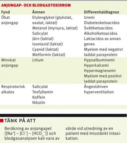 Ökat anjongap. Beräkning av anjongap hjälper till att upptäcka och kategorisera metabola rubbningar. Anjongapet beräknas genom att subtrahera serumkoncentrationen av natrium med klorid- och vätekarbonatkoncentrationen. Traditionellt anges ett normalt anjongap till 10–14 mmol/l, men mätt med patientnära apparatur ligger anjongapet ofta runt 6 mmol/l [28]. Gapet utgörs främst av negativt laddade proteiner. Ett ökat anjongap speglar extra anjoner i blodet, vilka i intoxikationssammanhang kan vara myrsyra (nedbrytningsprodukt av metanol), glykolat och oxalsyra (nedbrytningsprodukter av etylenglykol), salicylat eller laktat.