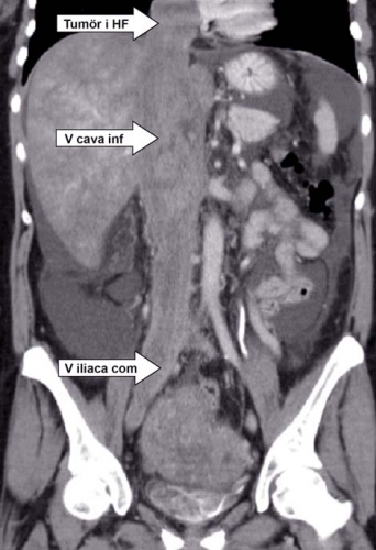 Patienten försämrades dock med tilltagande kraftig leversvikt; ny datortomografi verifierade leverstas och ascites. Det som tidigare uppfattats som en vena cava-trombos bedömdes nu som en heterogen tumörmassa (Figur 1), vilken också omfattade uterusområdet. Den tumörsuspekta tromben fyllde ut hela vena cava inferior och sträckte sig in i höger förmak (Figur 2).