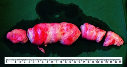 Fynden föranledde hysterektomi och bilateral salpingooforektomi. Vena uterina noterades dilaterad med misstänkt tumörinnehåll, men det var först postoperativt som histopatologi gav diagnosen intravenös leiomyomatos.