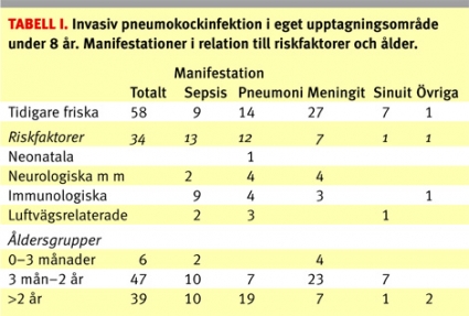 Totalt diagnostiserades 92 vårdkrävande episoder av invasiv pneumokocksjukdom hos 85 individer (Tabell I). I tabellen visas också riskfaktorer, åldersfördelning och sjukdomsmanifestation. Incidensen hos 0–6-åringar blev 15/100 000, hos 0–2-åringar 33/100 000. Vanligaste manifestation var hos de yngre meningit och etmoidit, hos de äldre sepsis och pneumoni. Underliggande riskfaktorer var vanligast vid sepsis hos yngre och vid meningit hos äldre barn.