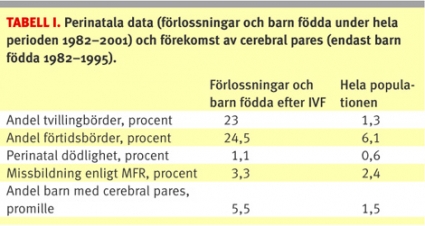 Huvudfynden i denna första utvärdering var en kraftigt ökad förekomst av flerbörder och förtidsbörder. Den perinatala dödligheten och missbildningsfrekvensen var måttligt ökad [8]. Risken för cerebral pares ökade fyrfaldigt (Tabell I). IVF-barnens genomsnittliga kognitiva utveckling låg inom normalvariationen för åldern, medan en något större andel av IVF-barnen hade en svag kognitiv förmåga [4]. De förhöjda riskerna förklarades huvudsakligen av den höga andelen flerbörder och i viss mån också av den något ökade risken att födas för tidigt vid enkelbörd. De svenska studierna har fått mycket stor genomslagskraft internationellt och har bland annat lett till att bruket att återinföra två eller fler embryon rutinmässigt kommit att omvärderas. Socialstyrelsen har i råd och anvisningar meddelat att återinförandet av endast ett embryo nu bör vara rutin [9].