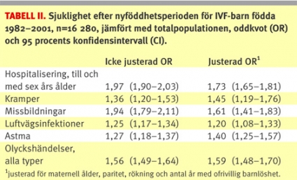 IVF-barnen hade en ökad sjuklighet (mätt som sluten vård) även efter nyföddhetsperioden. Vårdtillfällen kopplade till hjärnskada förekom i ökad omfattning. Även andra tillstånd var vanligare bland IVF-barnen såsom infektioner, astma, olycksfall och frakturer. För många av dessa tillstånd kvarstod ingen riskökning efter justering för skillnader i mödraålder, paritet, rökning och antal år av ofrivillig barnlöshet. De diagnoser där skillnader dock kvarstod redovisas i Tabell II.
