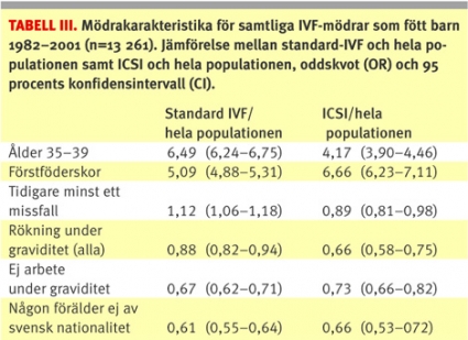 Vi har i denna utvärdering av IVF-verksamheten också granskat obstetriska och maternella data. Som förväntat är IVF-mödrarna äldre än övriga kvinnor som föder barn och oftare förstföderskor, vilket förstås kan kopplas till parens infertilitet. Att de röker mer sällan kan säkert förklaras med att dessa kvinnor är väl medvetna om faktorer som påverkar fertiliteten negativt. Att ICSI-mödrarna är något yngre än övriga IVF-mödrar beror antagligen på att det främst är en metod för behandling av manlig infertilitet. Detta avspeglas också i det faktum att ICSI-mödrarna haft färre spontanaborter än övriga IVF-mödrar.