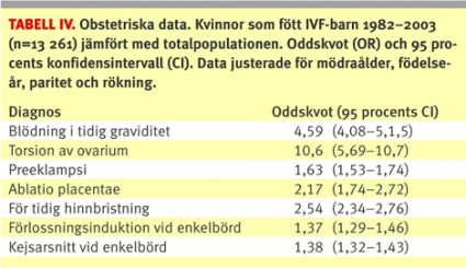 IVF-mödrarna vårdades i större utsträckning på sjukhus såväl före förlossningen (26 procent jämfört med 12 procent) som efter (5,4 procent jämfört med 3,8 procent) [15]. De löpte en starkt ökad risk för ovariell torsion. De hade också en ökad risk för blödningar i tidig graviditet och i viss mån även för preeklampsi, ablatio placentae, blödning vid vaginal förlossning samt förtidig hinnbristning. En viss ökad risk för tromboemboliska komplikationer sågs både före och efter förlossningen. Förlossningsinduktion och kejsarsnitt vid singelgraviditeter var vanligare, Tabell IV. ICSI-mödrarna tenderade att ha något lägre risk för komplikationer än andra IVF-mödrar.