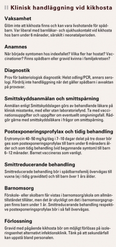 Vid kikhosta under slutet av graviditeten bör antibiotikabehandling övervägas för att om möjligt lindra sjukdomsförlopp och därmed smittspridning till det nyfödda barnet. Rådgör med infektionskonsult om bästa tidpunkt och handläggning i övrigt, inklusive ställningstagande till om förlossningen samt eftervård bör ske på isoleringsenhet på BB eller på infektionsklinik [19] (se även InfPreg http://www.InfPreg.se för information om smittsamma sjukdomar under graviditet och nyföddhetsperiod).
