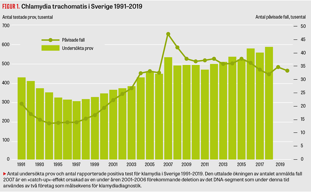 Sedan klamydia införlivades i smittskyddslagen 1988 är smittspårning en hörnsten i bekämpningen av klamydiainfektioner och håller hög internationell kvalitet. Det kan noteras att 56–57 procent av de rapporterade fallen är kvinnor och 43–44 procent är män [1]. Några säkra data finns inte om smittrisken vid ett enstaka vaginalt/analt samlag, men de flesta studier anger en smittrisk mellan 10 och 40 procent. Spontan utläkning av infektionen är vanlig; hälften till omkring två tredjedelar kan självläka inom ett år [2, 3]. Detta är också anledningen till smittspårning längre bak i tiden än ett år från indexpatient sällan är meningsfull [4]. En långvarig kvarstående infektion ökar sannolikt risken för tysta salpingiter och efterföljande infertilitet, vilket också kan förklara skillnader i risk för tubarfaktorinfertilitet i studier från 1980-talet respektive 2000-talet, eftersom mer omfattande provtagning med känslig detektion etablerades först på 1990-talet [3, 5-8].