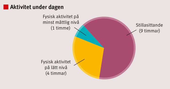 Forskning visar att barn sitter upp till 9 timmar per dag (Figur 1) [2], och stillasittandet (inklusive passiv transport, stillasittande skolarbete och skärmtid [tv-, dator- och tv-spelstid]) ökar med ca 30 minuter per år under uppväxten [3].