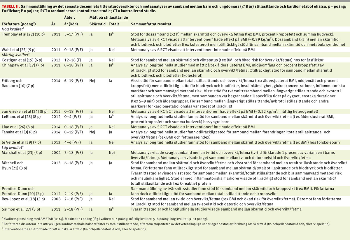 Övervikt/fetma. För yngre barn (0–5 år) hittades ingen litteraturöversikt om stillasittandets betydelse för övervikt/fetma. I Tabell II redovisas fyra litteraturöversikter (låg till måttlig kvalitet) som sammanställt forskning om samband mellan skolbarns och skolungdomars (6–18 år) stillasittande och övervikt/fetma [3, 16, 20, 21]. Den litteraturöversikt som bedömdes vara av högst kvalitet visade att det finns visst stöd för tvärsnittssamband mellan stillasittande och övervikt/fetma [16]. Tillsammans visade två färska litteraturöversikter (måttlig kvalitet) att det finns otillräckligt stöd för longitudinellt samband mellan ungas stillasittande och övervikt/fetma [3, 16].