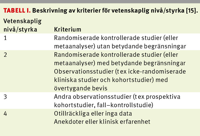 Slutligen graderades den vetenskapliga nivån/styrkan för respektive slutsats utifrån den skala som presenteras i Tabell I [15].