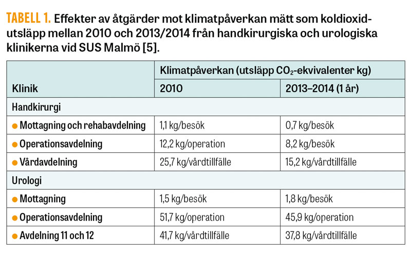 Metoden att kartlägga, identifiera och åtgärda koldioxidutsläpp användes på de två utvalda verksamheterna. Utvärderingen (Tabell 1) visade att den handkirurgiska kliniken fram till 2014 hade minskat sin klimatpåverkan från vårdavdelningen med 41 procent från 2010 då utgångsvärdet var 25,7 kg koldioxidekvivalenter/patient/vårdtillfälle. På liknande sätt hade klimatpåverkan från operationsavdelningen minskat med 33 procent från 12,2 kg koldioxidekvivalenter/patient/vårdtillfälle under 2010. För urologavdelningen var motsvarande siffror en minskning med 9 procent från 2010, då de två vårdavdelningarna släppte ut 41,7 kg koldioxidekvivalenter/patient/vårdtillfälle. En låg siffra, kan tyckas, men utgångsvärdet var från en avdelnings förbrukning och när utvärderingen genomfördes hade en avdelning tillkommit. Vid operationsenheten skedde en reduktion med 11 procent från ett utsläpp av 51,7 kg koldioxidekvivalenter/patient/operation under 2010.