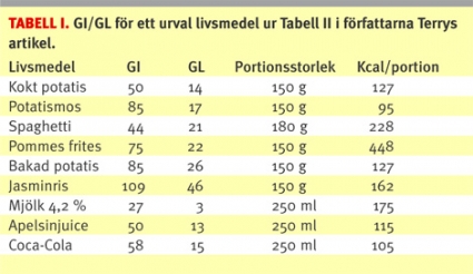 Författarna Terry har i sin artikel inledningsvis på ett klargörande sätt sammanställt de viktigaste begreppen och vad mätningar och tabellvärden grundar sig på. Glykemiskt index beskrivs som ett mått på kvalitativa skillnader mellan kolhydrater i olika kolhydrathaltiga livsmedel. Mätmetoderna för bestämning av GI beskrivs och kompletteras med en sammanställning av faktorer som kan inverka på GI-värdet. Svagheterna i metoden diskuteras också. Dessa svagheter är betydande, vilket återspeglas bland annat i skillnader mellan rapporterat GI för olika livsmedel från olika forskargrupper. GI för t ex bakpotatis varierar mellan 56 och 111, kidneybönor mellan 13 och 70, bananer mellan 30 och 70 osv (referens nr 5 i författarna Terrys artikel).