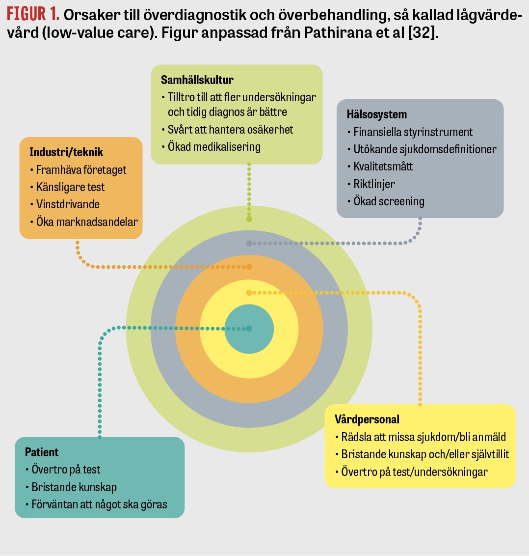 Överdiagnostik och överbehandling har uppmärksammats allt mer både i Sverige och internationellt [1], framför allt på grund av stigande vårdkostnader [2]. Noggranna beräkningar från USA visar att 20‒30 procent av sjukvårdsutgifterna går till åtgärder utan patientnytta [3]. Liknande resultat rapporteras från andra utvecklade länder [4], och även i Sverige går sjukvårdsutgifter till åtgärder som saknar patientnytta [2]. Förutom ökande kostnader leder överdiagnostik och överbehandling, så kallad lågvärdevård (low-value care), till undanträngningseffekter och risk för patientskada [5]. Behovet av att minska åtgärder med liten, tveksam eller ingen patientnytta har blivit ännu tydligare under coronapandemin [6].