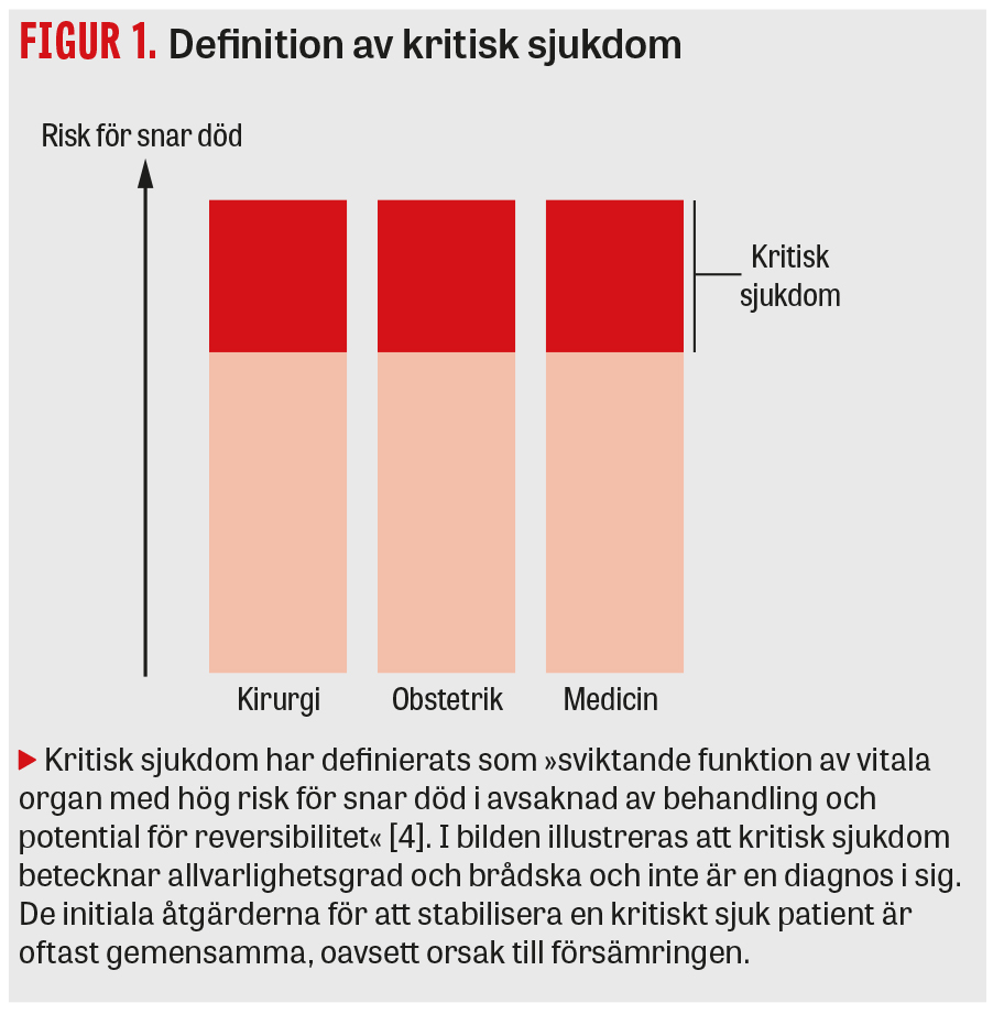 Kritisk sjukdom kan inträffa oavsett underliggande diagnos och innebär vital organsvikt med hög risk för snar död om inte stabiliserande åtgärder utförs (Figur 1) [4]. Baserat på internationella data upp- skattas årligen 30–45 miljoner vuxna bli kritiskt sjuka, de flesta i låg- och medelinkomstländer [5, 6], men detta är troligtvis en underskattning [7, 8]. Antalet intensivvårdplatser per 100 000 invånare varierar också stort, från 35 i USA till 6 i Sverige och 0,1 i Malawi [9]. Nyligen visades att var tionde inlagd patient i Sörmland är kritiskt sjuk, med minst en gravt avvikande vitalparameter och hög mortalitet. Av dessa vårdas >90 procent på vårdavdelningar [8, 10]. Behovet av vård för kritisk sjukdom är alltså störst i lågresursmiljöer och utanför Iva.