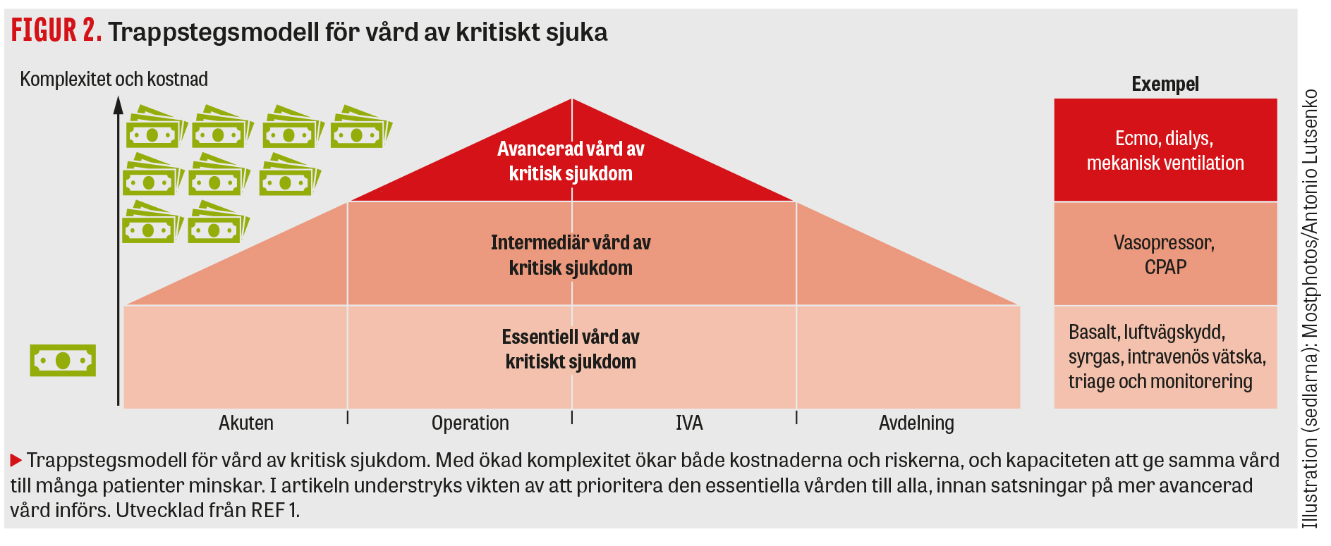 Ju mer begränsade resurserna är, desto högre är behovet av prioriteringar. Befolkningsnyttan blir större om effektiv vård med låg kostnad ges till många än om dyr vård ges till få. Samtidigt ökar också rättvisa och jämlikhet [11]. Basal vård vid kritisk sjukdom är mer kostnadseffektiv än avancerad [12-18]. En trappstegsmodell kan vägleda hur vården av kritiskt sjuka byggs upp för att nå störst nytta, både i Sverige och i lågresursmiljöer (Figur 2). Det första steget är att garantera alla patienter det fundamentala. Fokus är att identifiera alla patienter med vital organsvikt och att tillse att enkla, effektiva behandlingar ges oavsett tid på dygnet. När detta väl är uppnått kan man klättra vidare mot mer avancerad vård.
