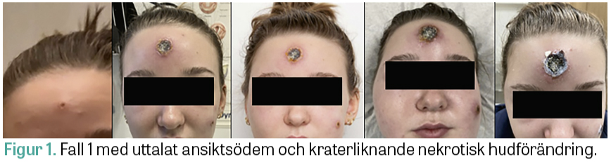 En tidigare väsentligen frisk 17-årig flicka sökte vårdcentralen på grund av en ulcererande hudförändring som hade tillvuxit under en vecka (Figur 1). Vårdcentralen misstänkte en sårinfektion och påbörjade antibiotikabehandling. Tillståndet förvärrades över de nästkommande dygnen med tillkomst av feber och ansiktsödem. Svullnaden i pannan, runt ögonen och på halsen gav misstanke om en allergisk reaktion, och man bytte ut antibiotikabehandlingen. På grund av fortsatt feber och tilltagande ödem blev hon under det efterföljande dygnet inlagd med antibiotika intravenöst. Flickan remitterades under inskrivningen (14 dagar efter insjuknandet) till hudkliniken för bedömning. Hudförändringen beskrevs som ett ungefär 2 centimeter stort, ulcererat och nekrotiskt sår lokaliserat medialt på pannan, med en svart skorpa centralt och en 3–4 millimeter bred gulorange upphöjd kant runt omkring. Även en mindre lesion på kinden samt multipla palpabla lymfkörtlar i ansiktet kunde konstateras. Hudbiopsier tagna 1,5 månader efter insjuknandet visade en inkonklusiv histologisk bild, men väckte misstanke om virusinfektion. Det framkom också att patientens katt hade haft ett fult sår och lymfadenopati cirka 3 veckor före flickans insjuknande. Folkhälsomyndighetens laboratorium hade tagit emot prov för analys för tularemi och leishmaniasis och rekommenderade, mot bakgrund av anamnes och bilder, tillägg av ortopoxvirus-PCR. PCR på hudbiopsin kunde detektera ortopoxvirus men inte mpoxvirus, och diagnosen kokoppor ställdes med ledning av PCR-resultat och klinisk bild. Såren läkte med ärrbildning i ansiktet. Annan mikrobiologisk utredning utfördes dessutom för tularemi, leishmaniasis, kattklössjuka (Bartonella henselae) och sporotrikos.