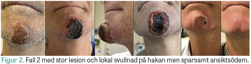 En 57-årig fysiskt aktiv man med hypertoni, bosatt på hästgård med katter och hundar, sökte vårdcentralen på grund av sår på hakan och höger armbåge. Mannen hade under en fjällvandring för 2 veckor sedan blivit myggbiten på dessa ställen. 2 dagar efter hemkomst uppstod svullnad, rodnad och vätskande sår och mannen ordinerades antibiotika. Efter 5 dagars antibiotikabehandling sökte mannen åter vårdcentralen med tilltagande feber, huvudvärk och ömmande lymfkörtlar på halsen. Diagnostiken kompletterades då med analyser för tularemi. 3 dagar senare hade lymfödemet på haka och hals förvärrats, och såren var krustabelagda och tilltagande i storlek. Tularemidiagnostiken utföll negativ och upprepades. Mannen lades in dagen därpå med frossa, nedsatt allmäntillstånd och ökat halsödem på misstanke om abscess. En datortomografiundersökning utfördes och visade inga tecken till abscess utan enbart mjukdelsödem. Såret reviderades kirurgiskt. Efter utskrivning uppmärksammade Folkhälsomyndigheten att remissen hade väckt misstanke om kokoppor och att en PCR-undersökning för ortopoxvirus hade utfallit positiv. Misstanken om kokoppor bekräftades därefter genom vidare sekvensering av provmaterialet. Såren läkte utan ärrbildning (Figur 2).