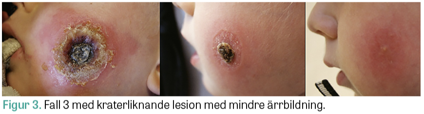 En 2-årig pojke utan bakomliggande sjukdomar fick ett mindre utslag på kinden som efter hand blev större och vätskande. Han ordinerades peroral antibiotikabehandling via vårdcentralen, vilket inte hade effekt, och behandlades därefter med antibiotika intravenöst på barnkliniken under 3 dagar. Patienten remitterades därefter för bedömning till infektionskliniken då såret blivit större och nekrotiskt i centrala delar. Vid undersökning hade barnet opåverkat allmäntillstånd. På ena kinden fanns en cirka 5 × 5 centimeter stor hudlesion med blåsvart nekros centralt med krustbildning i periferin samt omgivande rodnad. Patienten hade vistats en vecka på en bondgård där det fanns en katt och blev därför provtagen för kokoppor med positivt resultat i PCR. Vid uppföljande undersökning cirka 3 veckor efter att kokoppsinfektion diagnostiserats hade såret läkt, men viss ärrbildning kvarstod (Figur 3).