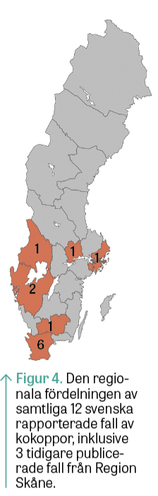 Kokoppor är tillräckligt sällsynta för att bli en utmaning för en enskild läkare att känna igen. Flera av fallen i serien blev diagnostiserade på initiativ från det nationella referenslaboratoriet vid Folkhälsomyndigheten efter att prov skickats in för annan utredning än kokoppor. Detta skulle kunna indikera att den svenska läkarkåren över lag har en låg medvetenhet om sjukdomsbilden och att det föreligger ett visst mörkertal. Immuniteten mot ortopoxvirus i den svenska befolkningen sjunker successivt efter att vaccinationsprogrammet mot smittkoppor upphörde cirka 1976. De flesta fallen rapporterades från södra Sverige och i synnerhet Region Skåne (Figur 4). Fallserien visar ett spektrum av kliniska förlopp (Tabell 1), ibland långdragna och med komplikationer. Det visar behovet av att utreda för kokoppor vid svårläkta sår med karaktäristiskt utseende, lymfadenopati och kontakt med utegående katter eller gnagare.