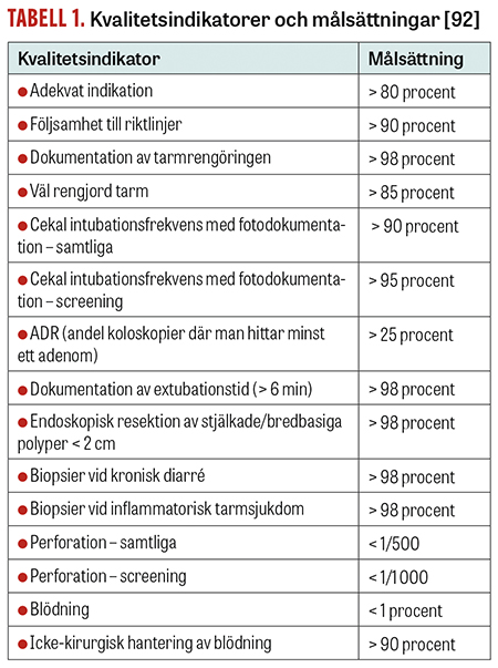 Endoskopisk uppföljning. Svensk gastroenterologisk förening har nyligen publicerat nationella riktlinjer för endoskopisk uppföljning efter kolorektal polypektomi (se separat artikel i detta nummer av Läkartidningen). Tyvärr visar tydliga data att riktlinjer inte följs och att koloskopi generellt överanvänds, vilket inte bara är kostnadsineffektivt utan också utsätter patienter för onödiga risker [22]. Endoskopiutlåtanden bör innehålla adekvata evidensbaserade rekommendationer för tidpunkt för nästa koloskopikontroll. Kvalitetsmålet är att minst 90 procent av alla patienter får rätt intervall till planerad uppföljningskoloskopi.