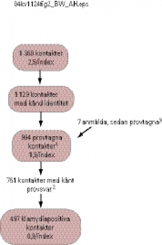 Folkhälsoinstitutets målsättning är att minst en kontakt per index ska provtas [11]. I Västerbotten provtogs 2002 nästan två kontakter per index, och nästan en kontakt per index var positiv. Andelen positiva kontakter var troligen ännu högre än enkätstudien visade. I totalt 321 fall visste inte kontaktspåraren som fyllde i enkäten om kontakten provtagits, och 233 av de provtagna kontakterna hade okänt provsvar. Av de 189 kontakter som anmäldes till Smittskyddsläkaren visste kontaktspåraren endast i 7 fall att kontakten senare provtogs. Enligt viruslaboratoriet vid Norrlands Universitetssjukhus provtogs 65 av kontakterna bosatta i Västerbotten. Totalt 76 kontakter bodde i andra län och remitterades dit. Resterande fick någon annan handläggning. Det är mycket troligt att klamydiapositiva kontakter uppgett index som en kontakt i sin egen kontaktspårning. Detta medför att samma person kan förekomma både som kontakt och som index i undersökningen. Eftersom vi inte känner till kontakternas identitet har vi inte kunnat korrigera för detta.