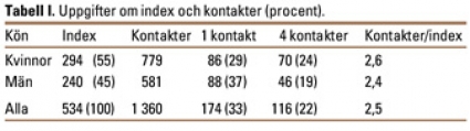 I genomsnitt uppgav index 2,5 kontakter vid kontaktspårning. I studier från andra delar av Sverige har siffrorna varierat mellan 1,4 och 2,2 [9, 14]. Kuratorernas och barnmorskornas patienter uppgav ungefär lika många partner, läkarnas betydligt färre. Minst kontakter uppgav patienter till kontaktspårare som bara utförde en spårning under 2002.