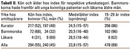 Jämförelse mellan yrkesgrupper. Kuratorer skötte 414 (78 procent) av kontaktspårningarna, varav 411 utfördes av de fyra kontaktspårningskuratorerna. Barnmorskor utförde 106 (20 procent), läkare 13 (2 procent), sjuksköterskor 1 (0,2 procent). (Se också Tabell II och III.)