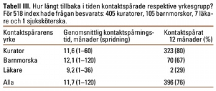 Totalt 14 personer (3 procent), varav 11 var läkare, utförde endast en kontaktspårning under året. Dessa 14 hittade sammanlagt 18 kontakter (1,3 kontakter/index): Hur långt tillbaka i tiden man kontaktspårat hade besvarats för 10 kontakter. I genomsnitt spårade man 9,3 månader (1–36), 4 (40 procent) kontaktspårade ≥12 månader.