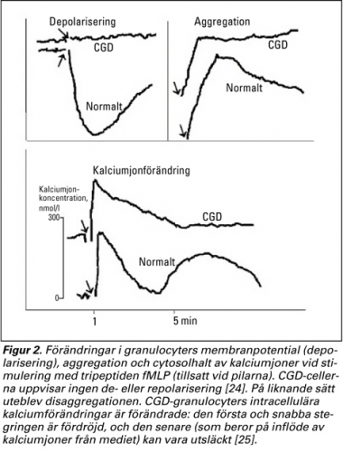 Omsättningen av intracellulärt kalcium är abnorm i CGD-granulocyter. Vid CGD har vi noterat en förlångsammad kinetik, som leder till högre totalhalt av Ca2+, något som kan medverka till starkare cellreaktioner (Figur 2) [25, 28].