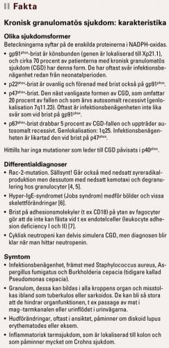 För några år sedan skrev vi i Läkartidningen om denna sjukdom, dess klassiska manifestationer och den dåvarande terapin [3] (se Fakta för beskrivning av de fyra formerna av CGD). Under de senaste åren har mycket nytt hänt på CGD-fronten, vilket ger en delvis annan bild av såväl sjukdomen som basala mekanismer för inflammation. Från att ha varit ett tillstånd där de flesta symtom förklarades med brist på syreradikaler, ser vi nu bilden tona fram av en sjukdom som även är associerad med en överdriven inflammatorisk reaktivitet. Denna kan bero på att syreradikaler i vanliga fall inaktiverar proinflammatoriska mediatorer, men att detta inte sker vid CGD.