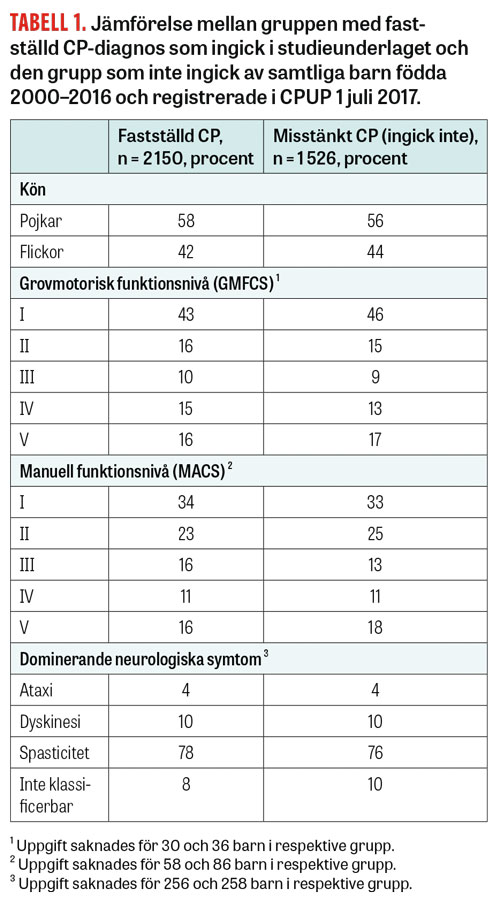 En retrospektiv genomgång har gjorts av registerdata från en i det närmaste total population barn med CP i Sverige: 3 676 barn födda 2000–2016 och registrerade i CPUP 1 juli 2017. Barnens funktionsnivåer klassificeras 1–2 gånger årligen enligt Gross motor function classification system (GMFCS) och Manual ability classification system (MACS), båda med en 5-gradig skala där nivå I innebär lägst funktionsnedsättning och nivå V störst nedsättning [19]. CP och CP-subtyp klassificeras efter 4 års ålder enligt Surveillance of cerebral palsy in Europe (SCPE) [1] och rapporteras till CPUP av neuropediatriker.